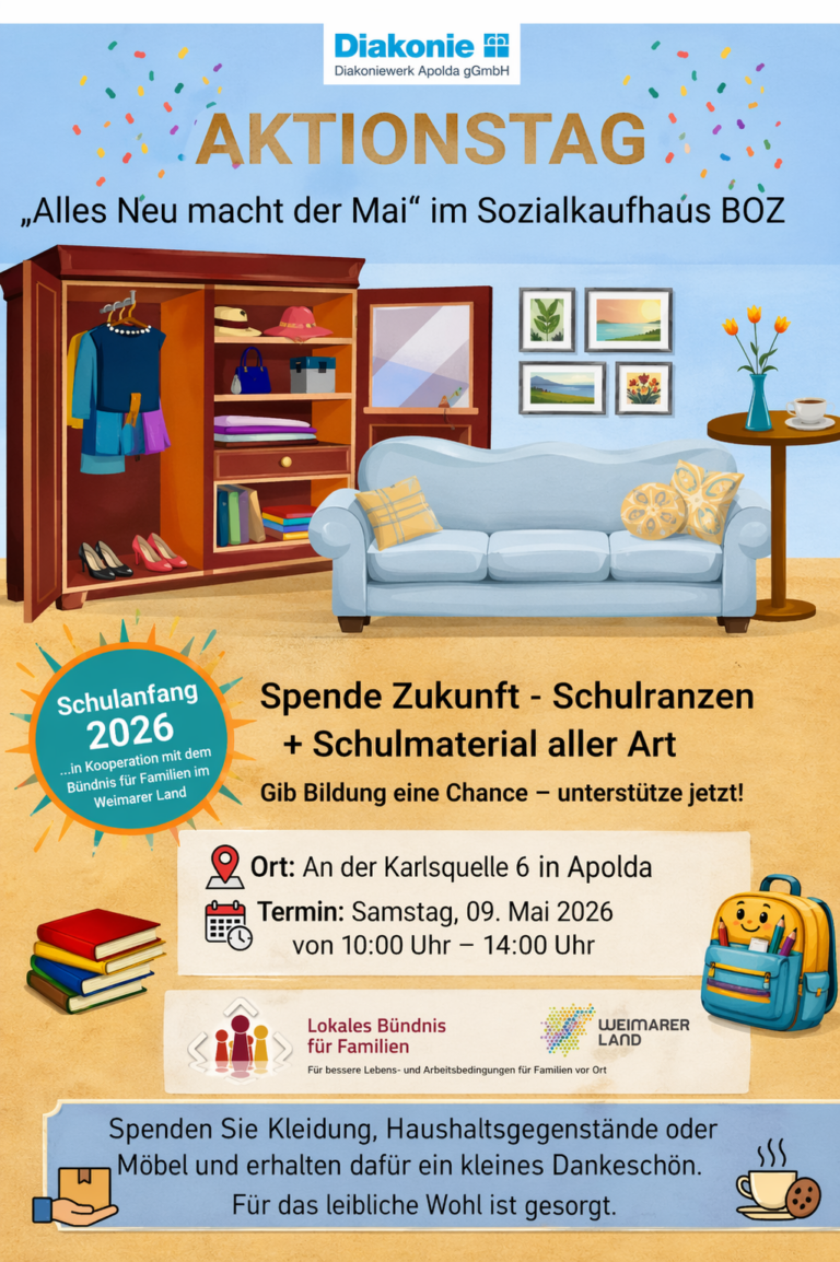Das Sozialkaufhaus BOZ lädt am 09.05.2026 zu einem besonderen Aktionstag in seine Räumlichkeiten in der Karlsquelle 6 in Apolda ein. In Kooperation mit dem lokalen Bündnis für Familien im Weimarer Land steht die Veranstaltung ganz im Zeichen der Unterstützung von Familien mit Schulanfängern.